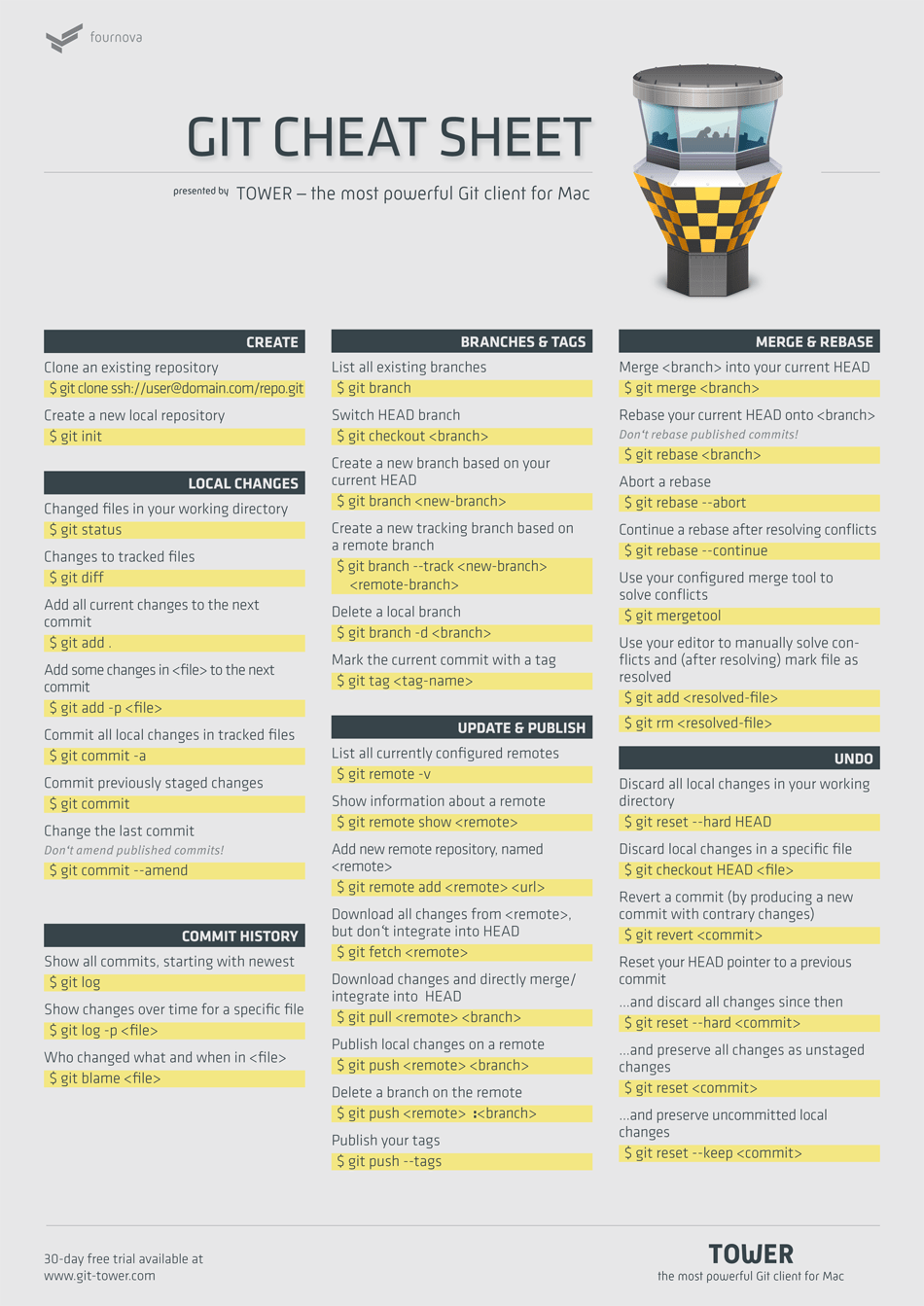Reference this git cheat sheet whenever you need a quick overview of some of the most popular git commands. Open command line for macosx user(git is usually preinstalled on mac . Git branches, remote repositories, undoing changes, and more. For example, fixing two different bugs should produce two separate commits. No git command cheat sheet would be complete without a section on the git vocabulary, so we've included one to help you get to grips with .